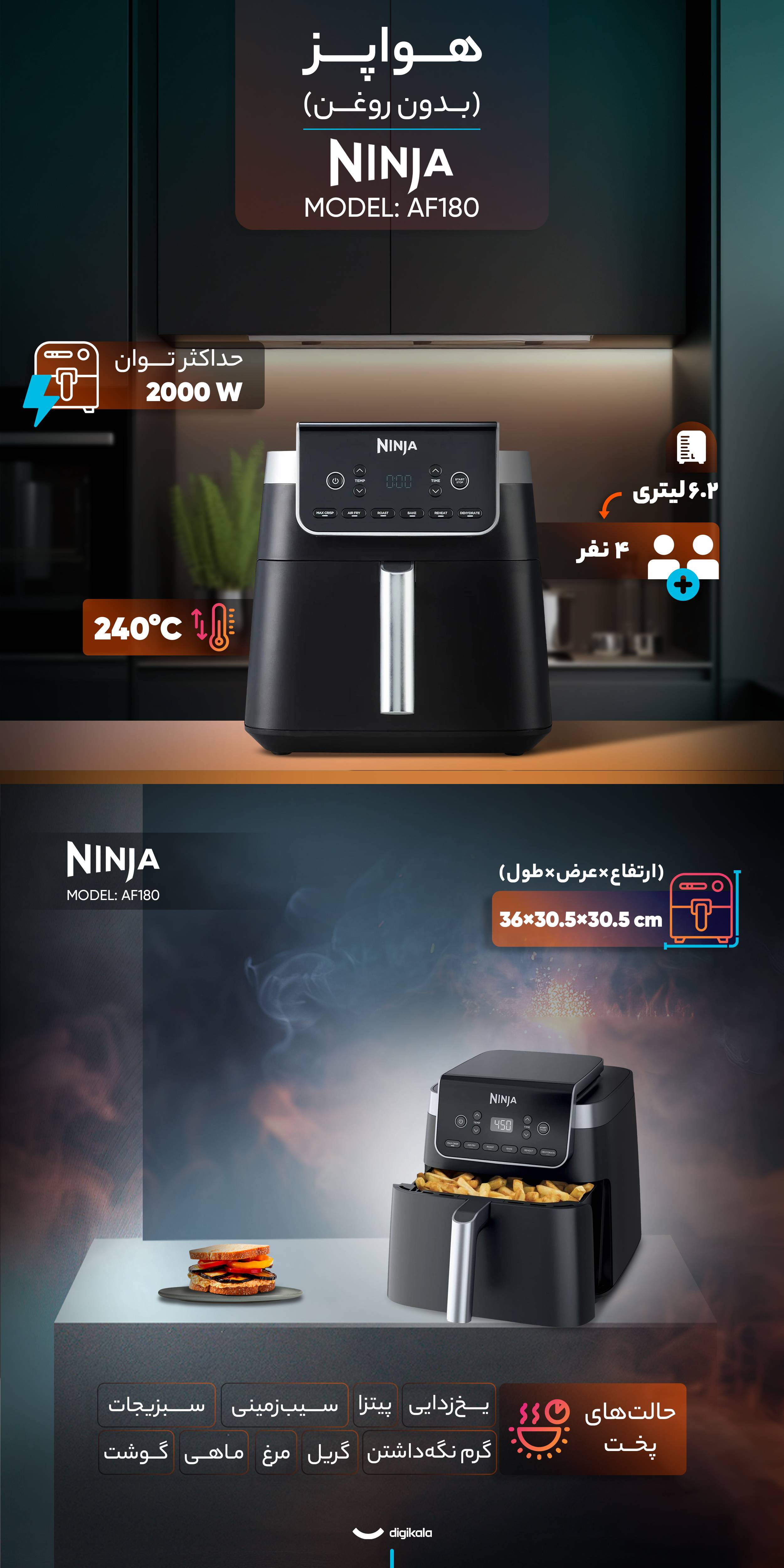 حداکثر توان مصرفی این هواپز ۲۰۰۰ وات است و بیشینه دمای آن ۲۴۰ درجه سانتیگراد میباشد. این توان بالا به همراه سیستم گرمایش گردش هوای داغ، موجب پخت یکنواخت و سریع غذاها میشود. هوای داغ به شکل یکنواخت در محفظه داخلی جریان مییابد و تمام سطوح غذا را در مدت کوتاهی میپزد، بدون آنکه نیاز به روغن زیاد باشد. نینجا AF180 مجهز به صفحه نمایش دیجیتال و چراغ نشانگر دما است که امکان کنترل دقیق فرآیند پخت را فراهم میکند. کاربر میتواند دما و زمان پخت را به دلخواه تنظیم کند. تایمر قابل تنظیم و قابلیت تنظیم دما، انعطافپذیری زیادی در آمادهسازی انواع غذاها فراهم میکند و امکان تنظیم دقیق با نیازهای غذایی مختلف را ایجاد میکند. حداکثر زمان قابل تنظیم برای پخت، آزادی عمل کافی برای دستورهای پیچیدهتر را نیز ارائه میدهد. هواپز AF180 دارای شش برنامه پخت پیشفرض است که شامل پخت مرغ، گوشت، ماهی، سیبزمینی، سبزیجات و پیتزا میشود. علاوه بر این، حالتهای پخت گریل، گرم نگه داشتن و یخزدایی نیز در دسترس هستند. این حالتها امکان آمادهسازی انواع غذاهای متنوع را فراهم میکنند و به کاربران اجازه میدهند غذاها را با کیفیت مشابه فر یا سرخکنهای سنتی تهیه کنند.