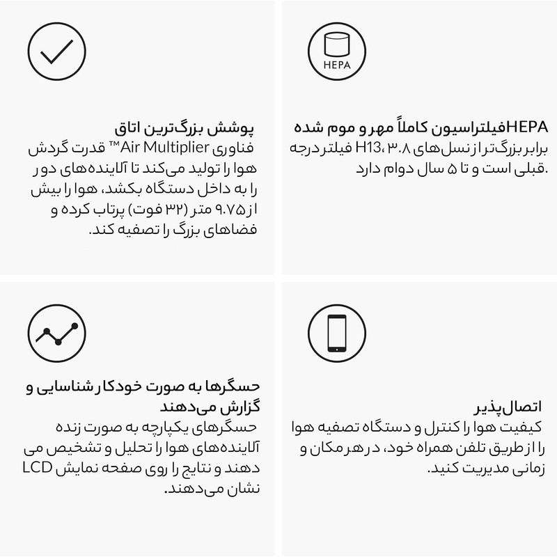 | سایر توضیحات | مناسب برای اتاقها و فضاهای تا حدود 100 متر مربع (بسته به چیدمان و طراحی محیط) / مراحل فیلتراسیون:- فیلتر 360 درجه HEPA: جذب ریز معلق ها تا 0.1 میکرون- فیلتر کربن فعال : برای جذب بو و ذرات ریز گازی- فیلتر انتخابی کاتالیتیک: برای جذب فرمالدهید و تبدیل آن به کربن دی اکسید و آب- فیلتر هوای خروجی از فیلتر HEPA: برای تضمین تمیزی و سلامت هوای عبوری از قسمت خروجی فیلتر ها / نشانگر تعویض فیلتر از طریق نمایشگر روی بدنه و از طریق هشدار داخل برنامه MyDyson / زمان تعویض فیلترHEPA در این محصول به صورت پیشنهادی توسط کارخانه هر 5 سال یکبار و یا بعد از مشاهده هشدار تعویض فیلتر از طریق برنامه موبایلMyDyson، هر کدام که زودتر اتفاق بیافتد؛ میباشد/ زمان تعویض فیلتر Carbonدر محصول BP04 به صورت پیشنهادی توسط کارخانه هر 2 سال یکبار و یا بعد از مشاهده هشدار تعویض فیلتر از طریق برنامه موبایل MyDyson، هر کدام که زودتر اتفاق بیوفتد، میباشد / فن از نوع داخلی و با تکنولژی کاملا ایمن دارد.- طراحی بدون پره (Air Multiplier) برای جریان یکنواخت هوا و ایمنی بالا- عملکرد بیصدا در سطوح پایین / سنسورهای دستگا:- سنسور تشخیض فرمالدهید- سنسور تشخیض بو و دود- سنسور تشخیص ریز معلق ها؛ شناسایی سطح ذرات (PM2.5 و PM10)- سنسور تشخیص دما و رطوبت- سنسور تشخیص نیتروژن دی اکسید / بازه نوسان حرکتی: امکان چرخش دستگاه تا 50 درجه برای پخش یکنواخت هوای تصفیه شده در فضای وسیعتر / تنظیمات تایمر: اجازه میدهد زمان کارکرد دستگاه از ۱۵ دقیقه تا ۹ ساعت برنامهریزی شود / نظارت بر عمر فیلتر: زمانی که فیلتر نیاز به تعویض دارد، به کاربر هشدار میدهد تا عملکرد دستگاه حفظ شود / حالت های عملکرد:- اتوماتیک (تنظیم سرعت و شدت متناسب با آلودگی هوا)- حالت شب (عملکرد کمصدا با نور کمرنگ صفحهنمایش)- حالت ECO (صرفهجویی در انرژی)- حالت فقط تصفیه (بدون پخش باد) / ۱۰ سطح سرعت فن قابل تنظیم دستی |