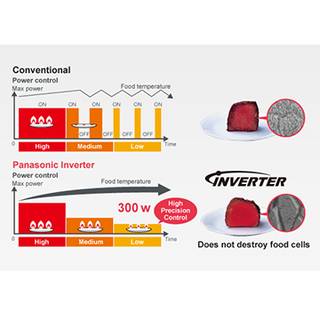 تکنولوژی اینورتر بهکاررفته در مایکروویو مدل NN-CD997S پخت باکیفیت و یکنواختی را رقم میزند. مایکروویوهای فاقد این ویژگی، در دمای پخت پایینتر، برای دستیابی به نتیجهی مورد نظر از قطع و وصلکردن مداوم عملکرد دستگاه استفاده میکنند. این کارکرد میتواند منجر به سوختن لبهها و سطح بیرونی غذا و پخت نامطلوب قسمتهای داخلی شود. تکنولوژی اینورتر با کنترل دقیق، توان غذا را با کیفیت عالی و پخت یکنواخت آمادهی سرو میکند.