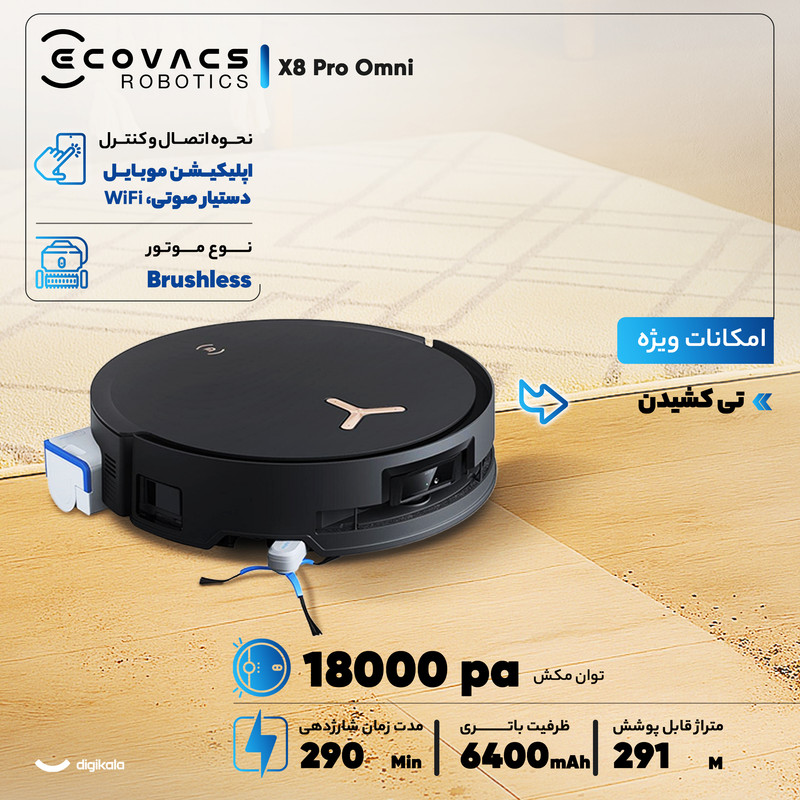ECOVACS X8 Pro Omni یکی از پیشرفتهترین و قدرتمندترین جاروهای رباتیک موجود در بازار است که با ترکیب فناوری مکش فوقالعاده، تیکشی بهینه، سیستم نقشهبرداری هوشمند و ایستگاه تخلیه و شستوشوی خودکار، تجربهای بینظیر از نظافت هوشمند را ارائه میدهد. مکش 18000 پاسکالی این جارو، ریزترین ذرات گردوغبار، موهای حیوانات خانگی، پرزها و حتی زبالههای درشت را بهراحتی از روی سطوح سخت و فرش جمع میکند. بر خلاف بسیاری از جاروهای رباتیک که از تیهای ساده برای شستوشو استفاده میکنند،X8 Pro Omni ازتیکشی چرخشی بهره میبرد که با چرخش و اعمال فشار روی سطح، لکهها و آلودگیهای سرسخت را بهطور مؤثری پاک میکنند. پس از اتمام نظافت، پدهای تیکشی بهصورت خودکار در ایستگاه Omni شسته و سپس با هوای گرم خشک میشوند تا از ایجاد بوی نامطبوع و رشد باکتریها جلوگیری شود.داک شارژ X8 Pro Omni عملکردی فراتر از یک شارژر دارد. این ایستگاه پیشرفته شامل:تخلیه خودکار مخزن گردوغبار که نیاز به تخلیه دستی را تا چندین هفته کاهش میدهد.شستوشو و خشککردن پدهای تی برای بهداشت بهتر و جلوگیری از رشد قارچ و باکتریها. مدیریت خودکار مخازن آب که باعث میشود فرآیند نظافت بدون نیاز به پر کردن و تخلیه مداوم آب انجام شود.این مدل دارای سنسور تشخیص فرش است که به محض ورود به سطح فرش، بهطور خودکار مکش را افزایش داده و پدهای تی را بالا میبرد تا از خیس شدن فرش جلوگیری کند. X8 Pro Omni از فناوری TrueMapping 2.0 برای اسکن محیط استفاده میکند که با ترکیب لیزر LIDAR و هوش مصنوعی، نقشهای دقیق و سهبعدی از خانه ایجاد میکند. از برخورد با مبلمان و موانع جلوگیری شود.از سقوط از پلهها و سطوح بلند پیشگیری کند.کابلها، اسباببازیها و سایر موانع کوچک را تشخیص داده و به آنها گیر نکند.