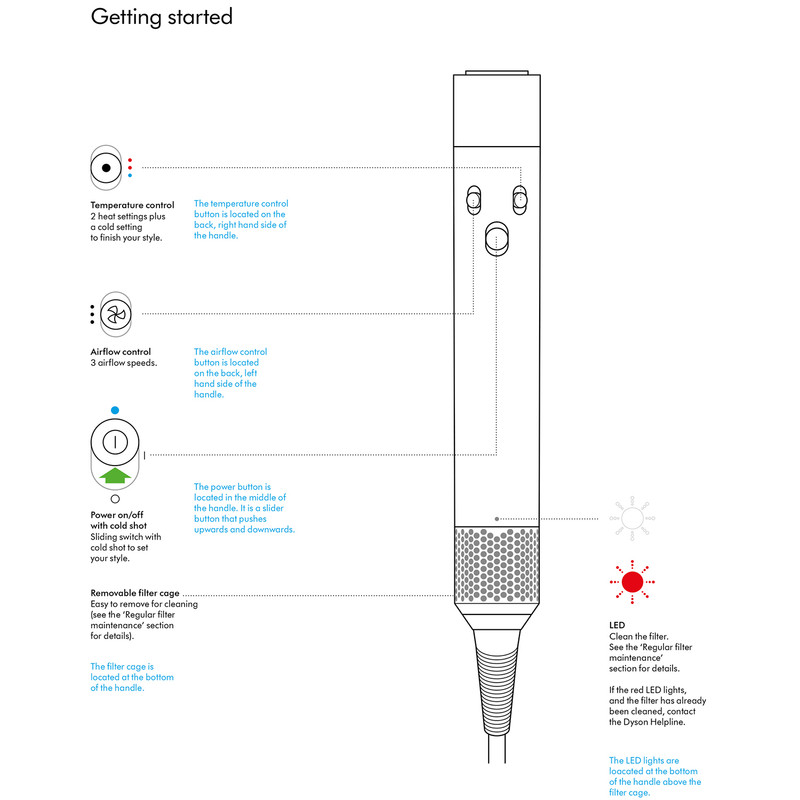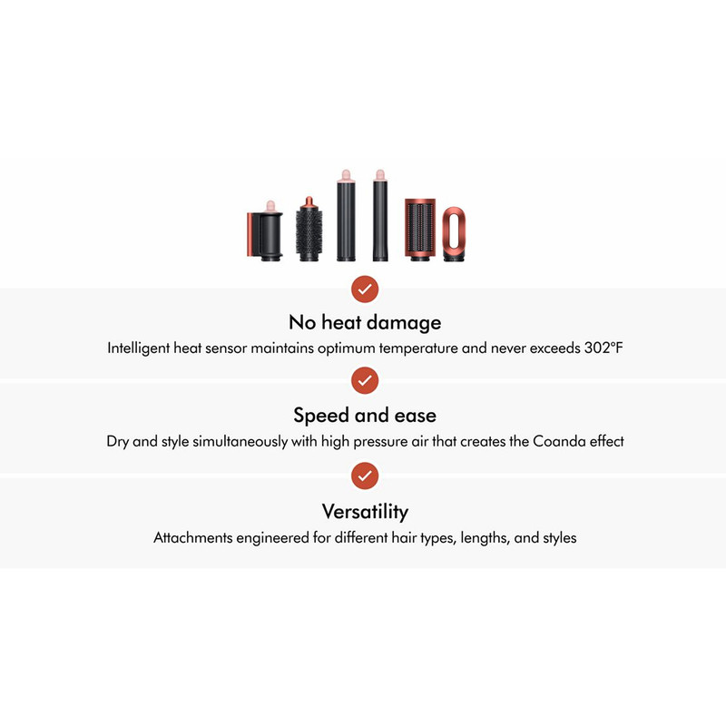 سایر مشخصات مناسب برای انواع مو، شامل نازک، ضخیم و فر /سیستم ضدگره و ضد الکتریسیته ساکن جهت جلوگیری از آسیب به مو / دارای فیلتر قابل جداسازی و شستو شو / سیستم کنترل حرارت و شدت جریان بادi.d. Curl/ هوش مصنوعی در حالت‌دهی: برای اولین بار، Dyson Airwrap به کمک اپلیکیشن و اتصال بلوتوث، تنظیمات شخصی‌سازی‌شده شامل نوع مو، جهت چرخش، دما و زمان را ذخیره و اجرا می‌کند. / تصال بلوتوث و اپلیکیشن MyDyson:امکان همگام‌سازی دستگاه با گوشی هوشمند، ایجاد پروفایل شخصی مو، دریافت آموزش‌ها و دستورالعمل‌های اختصاصی / فناوری Coanda بدون حرارت آسیب‌زا: استفاده از جریان هوای منحنی اثر Coand برای کشیدن مو به سمت سری و حالت‌دهی طبیعی بدون استفاده از حرارت بالا، که باعث محافظت از مو می‌شود. / کنترل هوشمند دما:حسگرهای حرارتی داخلی دما را بیش از ۴۰ بار در ثانیه بررسی می‌کنند تا دمای دستگاه هرگز به حد آسیب نرسد./ سری‌های متنوع قابل چرخش دو جهته:سری‌های Airwrap به‌راحتی می‌توانند با یک دکمه، جهت چرخش را تغییر دهند؛ نیازی به تعویض سری برای جهت فر نیست./ طراحی سبک، ارگونومیک و کم‌صدا:با وزن حدود ۶۰۰ گرم و صدای کمتر از سشوارهای سنتی، استفاده روزانه بدون خستگی و مزاحمت صوتی فراهم شده است./ موتور دیجیتال Dyson V9:یک موتور بسیار کوچک، سبک و قدرتمند که تا ۱۱۰٬۰۰۰ دور در دقیقه می‌چرخد و جریان هوای دقیق و متمرکز ایجاد می‌کند./
